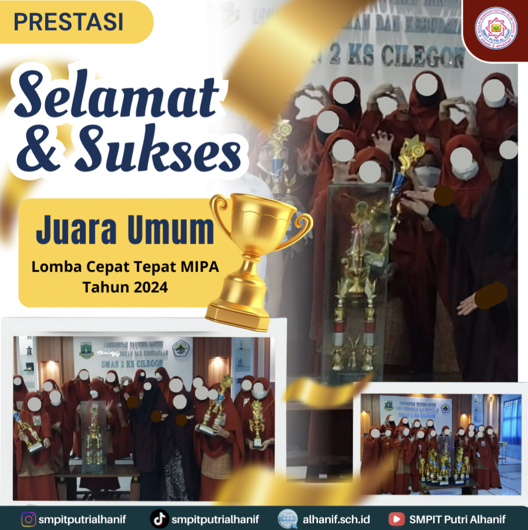 Selamat dan sukses kepada siswi SMPIT Putri Al Hanif yang berhasil meraih ???? Juara Umum Lomba Cepat Tepat MIPA Tahun 2024 yang diselenggarakan oleh SMAN 2 KS Cilegon.